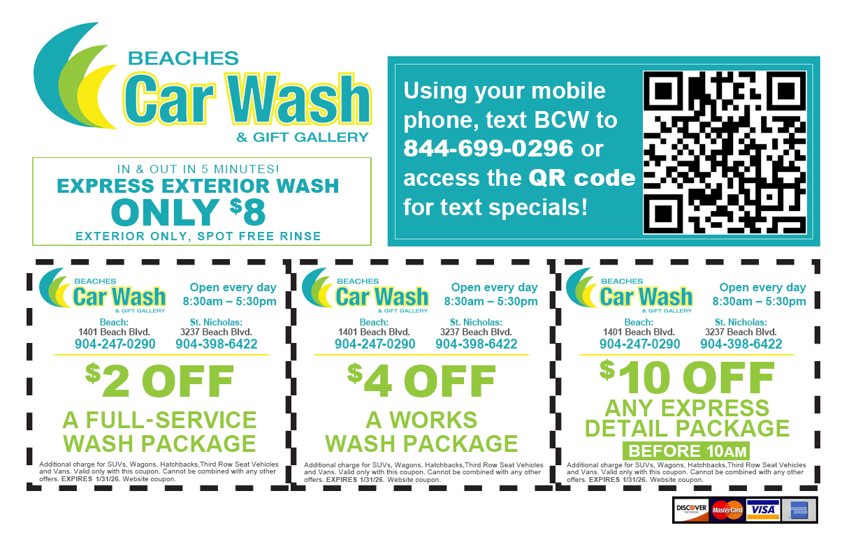 Beaches Car Wash offers monthly specials and discounts on our services. Clip your coupons and visit today to redeem these great deals!